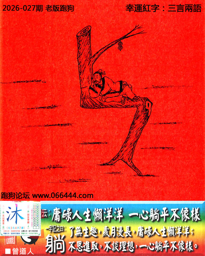 027期老版跑狗一字記之曰:【躺】 詩雲:庸碌人生懶洋洋,一心躺平不像樣。 了無生趣,崴月漫长,庸碌人生懶洋洋; 不思進取,不談理想,一心躺平不像樣。 玄機測字:《沐》