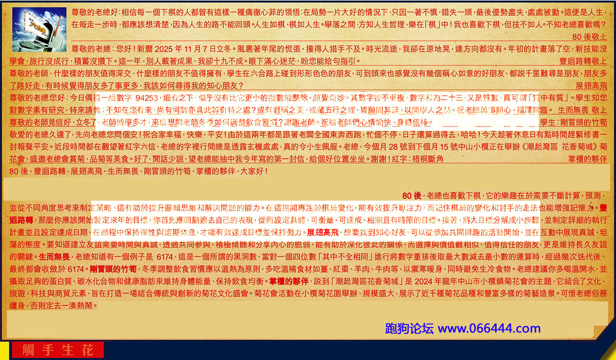 【6】.敬愛的老總久違了,先向老總您問個安祝合家幸福,快樂,平安!由於這兩年都是跟著老闆全國東奔西跑,忙個不停,日子還算過得去,哈哈!今天趁著休息日有點時間趕緊修書一封報聲平安。近段時間都在觀望著紅字六信,老總的字裡行間總是透露玄機處處,真的令小生佩服。老總,今個月28號到下個月15號中山小欖正在舉辦《潮起灣區 花香菊城》菊花會,盛邀老總會賞菊,品菊等美食。好了,閒話少說,望老總能抽中我今年寫的第一封信,給個好位置坐坐。謝謝!紅字:梧桐斷角 掌櫃的夥伴